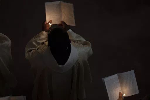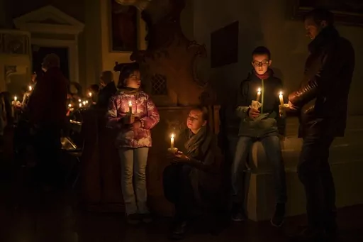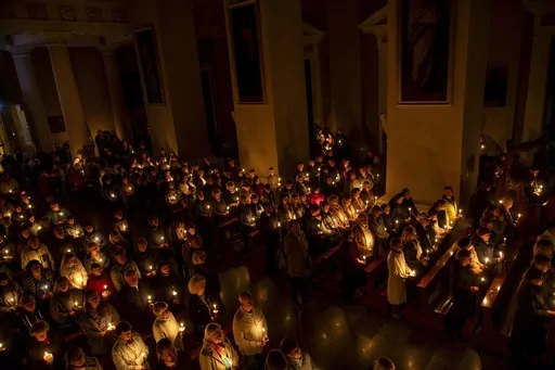 In Ukraine, clerics read prayers before lighting the holy fire during the Easter religious service at the St. Nicholas Roman Catholic Church in Kyiv.