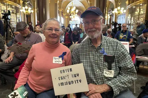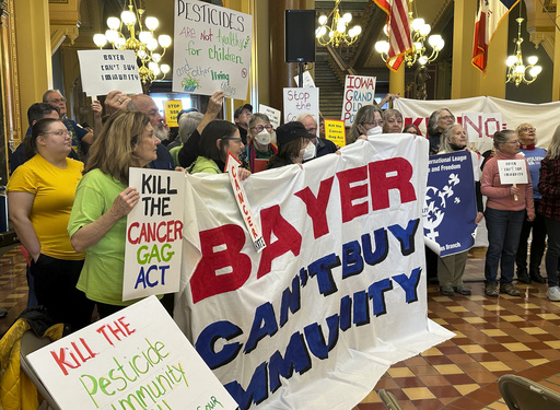 DES MOINES, Iowa (AP) — A renewed and expanded effort from chemical giant Bayer to shield itself from lawsuits that claim its popular weedkiller Roundup causes cancer brought dozens of protesters to the Iowa Capitol building Monday begging lawmakers to reject it.