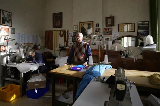 In their warm workshop decorated with ancestral photos, the couple bend over their sewing machines. They are busy putting the finishing touches to the delicate lace details adorning the carnival costumes that will send a whole town into rapture once paraded through the cobbled streets of Binche.