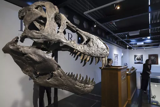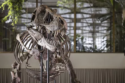 BERLIN (AP) — A Swiss auction house that sold a composite Tyrannosaurus rex skeleton for over $5 million this week said Friday that the new owner, a Belgian art foundation, will exhibit the fearsome dinosaur at a new cultural center in Antwerp.