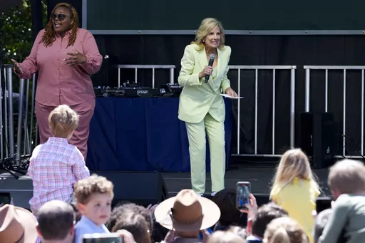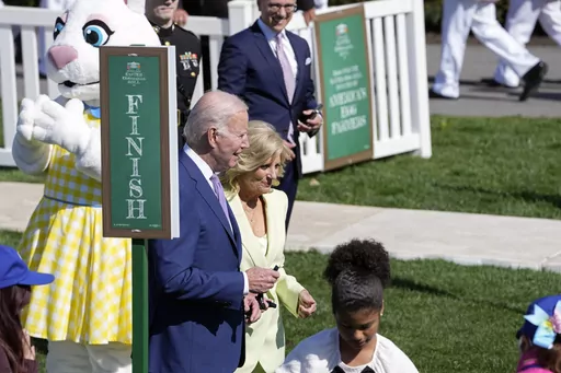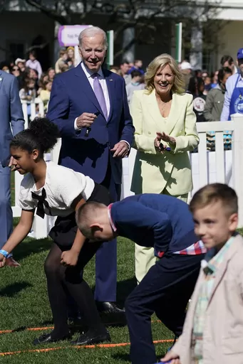 Biden and the first lady then went to the lawn, each one blowing a whistle to kick off egg-rolling competitions. Vice President Kamala Harris and her husband, Doug, applauded as another group of children coaxed dyed, hard-boiled eggs to the finish line in a separate area.