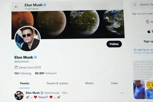 “We need to pay the bills somehow! Twitter cannot rely entirely on advertisers. How about $8?” Musk replied. On Saturday, the company announced a subscription service for $7.99 monthly that allows anyone on Twitter to pay a fee for the check mark “just like the celebrities, companies and politicians you already follow” as well as some premium features — not yet available — like getting their tweets boosted above those coming from accounts without the blue check. It's not clear when the fee-based verification tag will become available. It replaces what had been considered a safety feature designed to discourage counterfeit accounts.