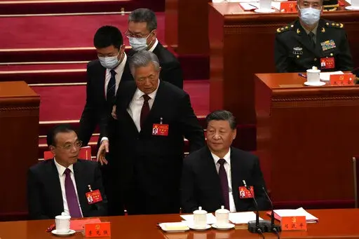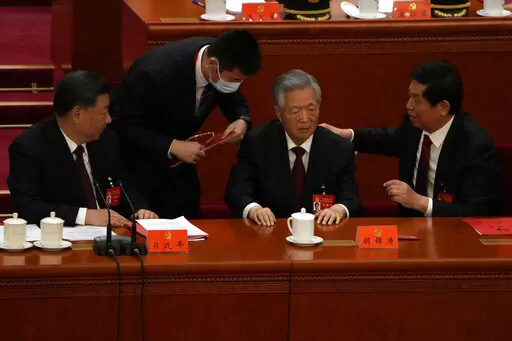 Hu, 79, spoke briefly with Xi, whom he had been sitting next to in the front row, before walking off with an assistant holding him by the arm. Jiang Zemin, 96, who was president before Hu, did not appear at this congress.