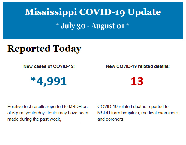 * New COVID-19 positive test results reported to MSDH for the three-day period July 30 through August 01 as of 3 p.m. yesterday *