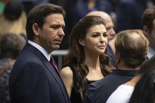 Monday's ceremony brought political opponents to the same hallowed ground, though they did not appear to be interacting. Harris, who arrived with New York Democratic Gov. Kathy Hochul, passed not far from where DeSantis and his wife stood.