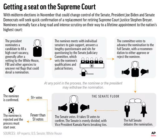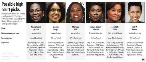 Jackson was confirmed to the appeals court by a 53-44 vote, winning the backing of three Republicans: South Carolina's Lindsey Graham, Maine's Susan Collins and Alaska's Lisa Murkowski. That could be important to Biden, who has been reaching out for GOP support as he chooses a nominee. Another GOP connection: Jackson is related by marriage to former House Speaker Paul Ryan, R-Wis.