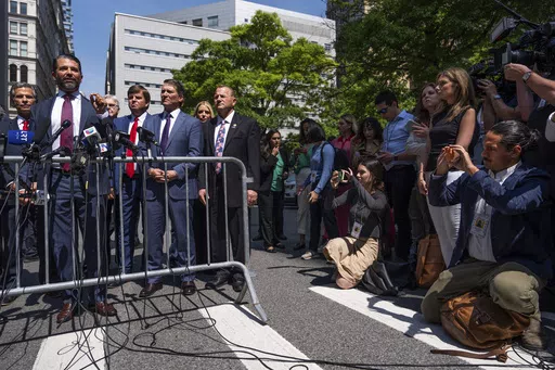 A group of Donald Trump's allies that included Republican state leaders, lawmakers, state attorney generals and his son Donald Trump Jr. held a news conference near the courthouse in Manhattan on Tuesday morning.