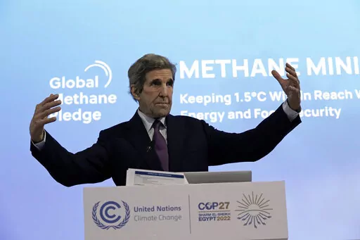 U.S. climate envoy John Kerry gave an update on the pledge, which was launched at last year’s COP26 meeting in Glasgow, Scotland with about 100 countries signed up.