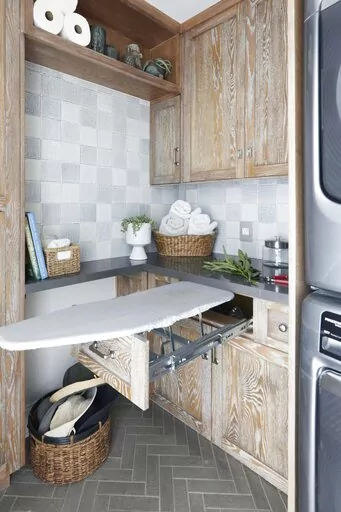 “Laundry rooms often double as linen and utility closets,” says Los Angeles designer Jessica Nicastro. She integrates ironing boards and energy-saving drying racks vertically into cabinetry.