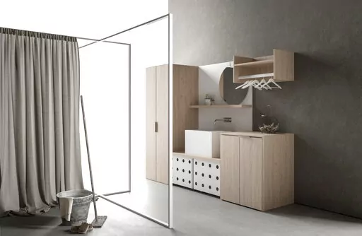 To name a few: MandiCasa’s Drop system includes base, column and hanging cabinets, racks, deep drawers, vanities and other elements, including some specifically for laundry: drying rods and a drop-down folding table. The modular collection is made of sustainably produced, wood-grained melamine.