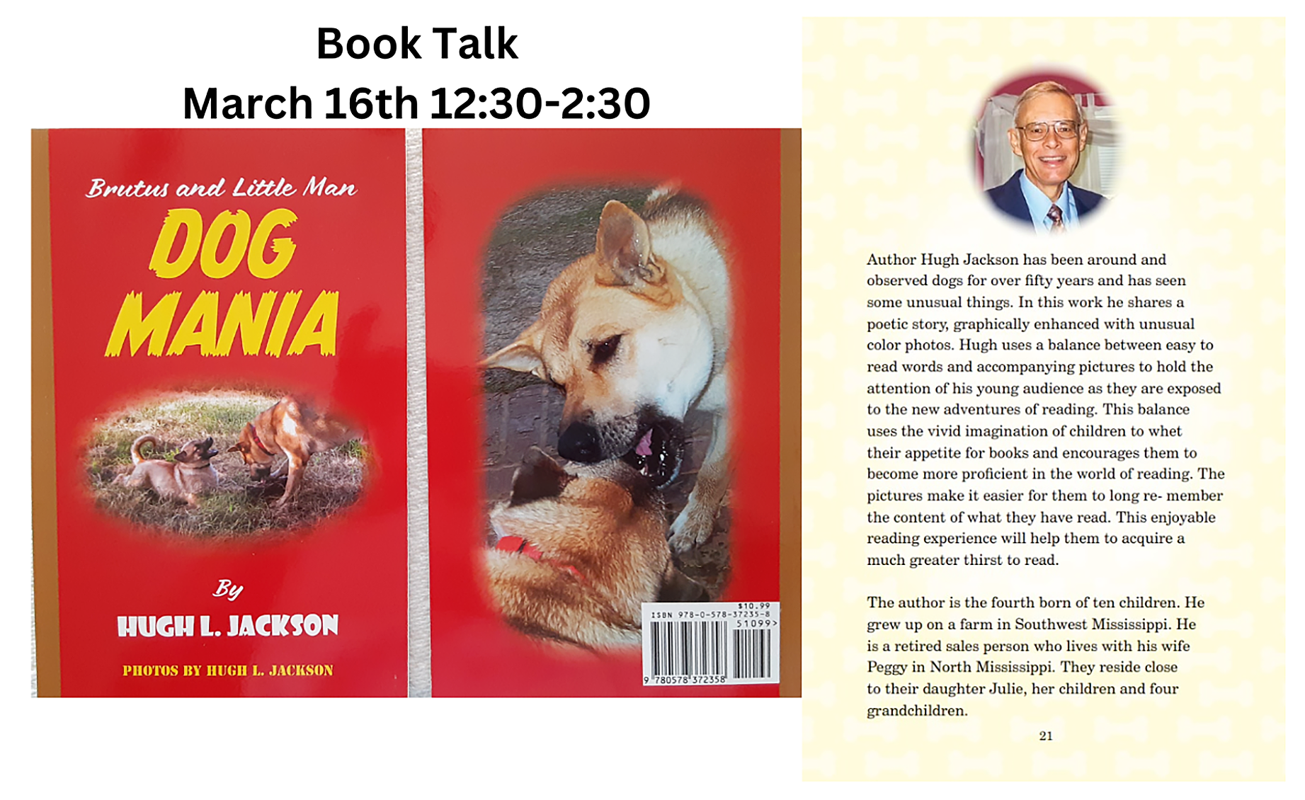 Mississippi author Hugh Jackson will visit Grenada from 12:30 p.m. until 2:30 p.m. on March 16 at the Elizabeth Jones Library to talk about his new book “Brutus and Little Man Dog Mania.”