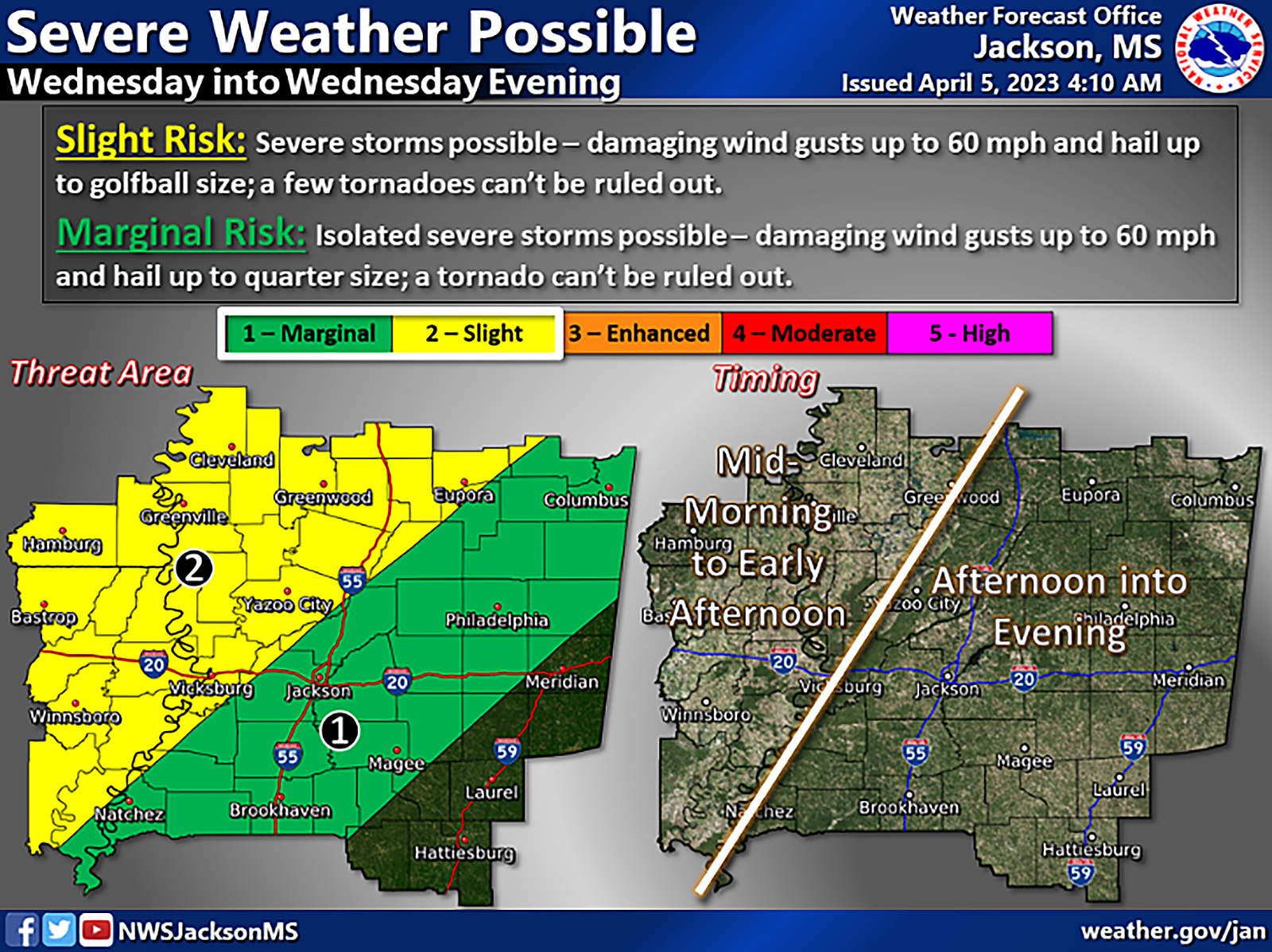 Grenada County and several surrounding counties are at a slight risk for possible severe weather today, Wednesday, April 5, beginning in the early parts of the afternoon and on into the evening.