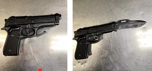 He was carrying a replica handgun with a large blade that folded out of it similar to a pocket knife, according to police, who released a photo of the weapon.
