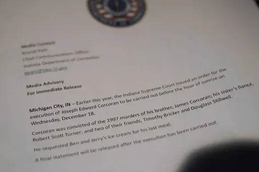 Corcoran's attorneys have fought the death penalty sentence for years, arguing he is severely mentally ill, which affects his ability to understand and make decisions. Corcoran exhausted his federal appeals in 2016, and this month his attorneys asked the Indiana Supreme Court to stop his execution but the request was denied.