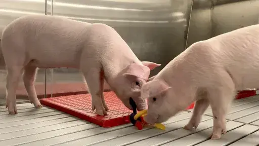 Company video shows piglets running around behind the protective barrier, chewing on toys and nosing balls back and forth.