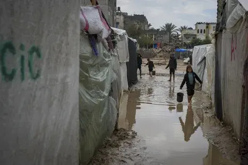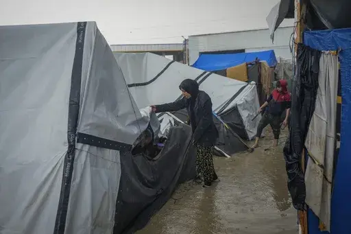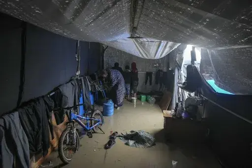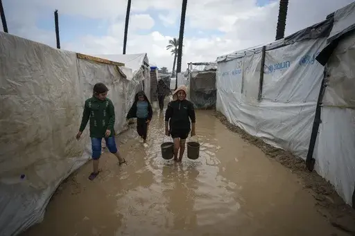 DEIR AL-BALAH, Gaza Strip — Palestinians are bailing muddy water out of their frigid tents after heavy rains in war-ravaged Gaza.