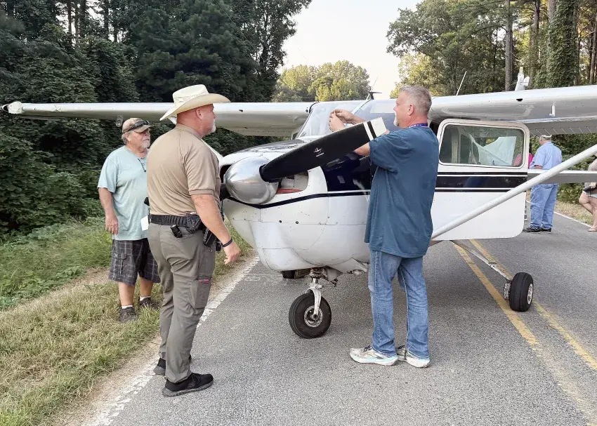 Grenada County Sheriff's Office deputy Garrett Pollan speaks with pilot Robert Riley of Hernando Friday afternoon after successfully landing his plane in the roadway in Gore Springs.