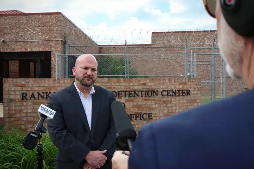 Jason Dare, attorney for the Rankin County Sheriff's Department, addressed a press conference outside the department Thursday, May 1, 2025, to announce a $2.5 million settlement of the "Goon Squad" case. Credit: Mukta Joshi/Mississippi Today