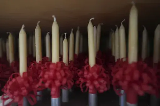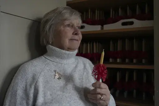 After Rice delivered a final blessing, Linda Thudium walked up the stairs and opened a large closet, where the congregation keeps thousands of handmade candles wrapped in red ribbons that they light during Christmas services.