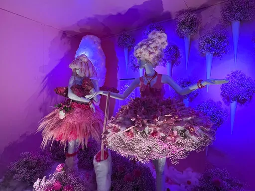 Among them, “Eye Candy,” presented by Schaffer Designs of Philadelphia, evokes the colors and scents of sweets, as mannequins with flowers where their heads should be and a giant, pink petal-frosted doughnut are among the confections glowing under neon lights.