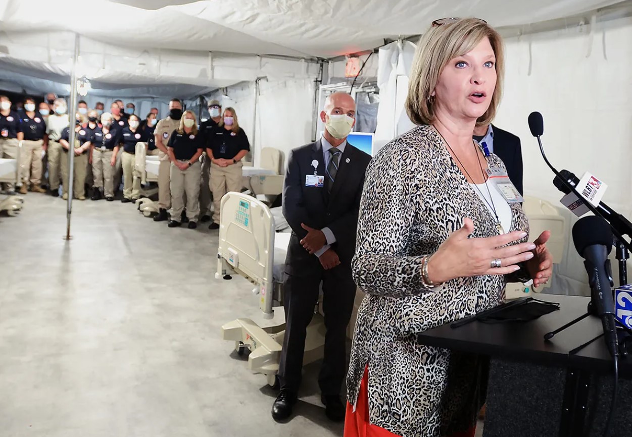 Woodward gave the speech as state officials unveiled a second field hospital set up in a UMMC parking garage — a necessity because the large medical center, like every other hospital in the state, has no additional staff capacity to adequately serve the surge of COVID patients. Samaritan’s Purse, a national disaster relief organization, is staffing and funding the second field hospital that will also include ICU beds.