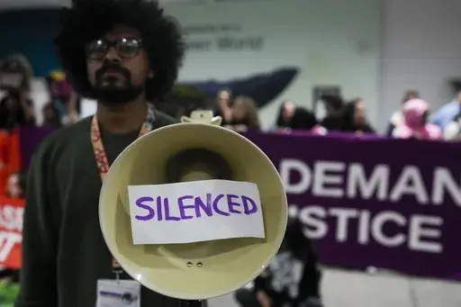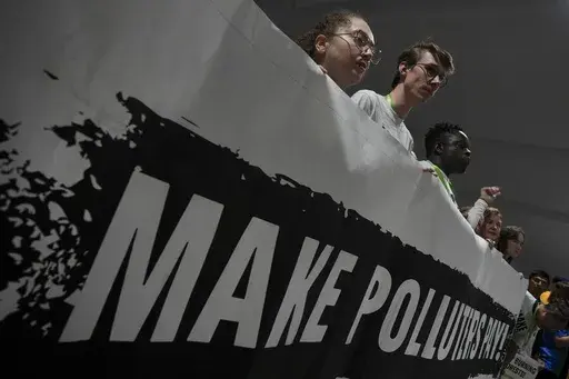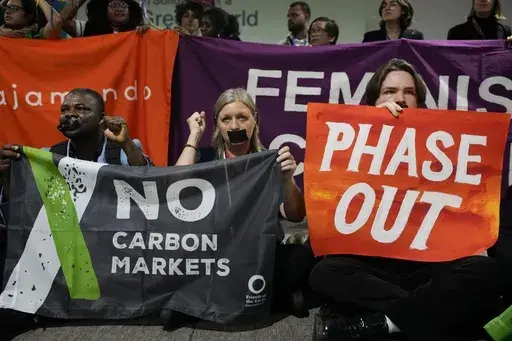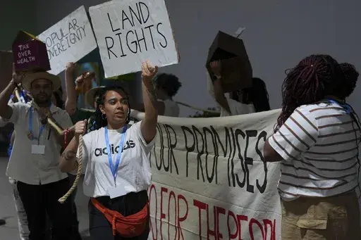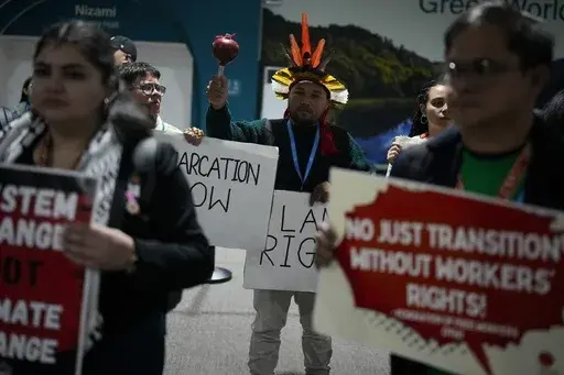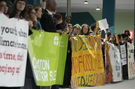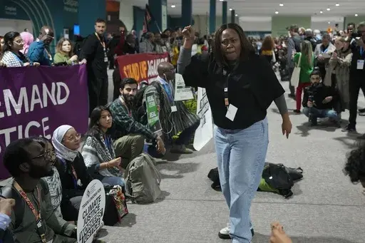 Demonstrators held up signs calling for more money to be pledged for climate finance, which involves cash for transitioning to clean energy and adapting to climate change. It comes as negotiators at the venue try to hammer out a deal for exactly that — but progress has been slow and observers say the direction of any agreement is still unclear.