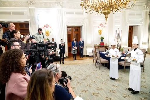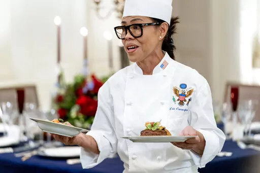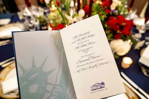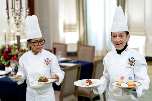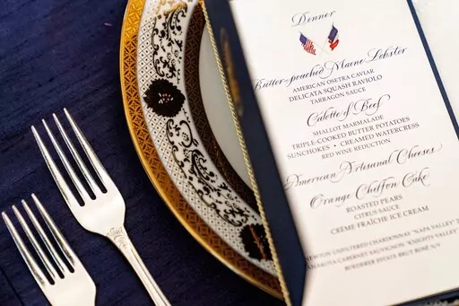 WASHINGTON (AP) — Butter-poached Maine lobster, beef with shallot marmalade and an American cheese trio will be served when French President Emmanuel Macron takes his seat Thursday as the guest of honor at a red-white-and-blue themed White House state dinner, the first for President Joe Biden.