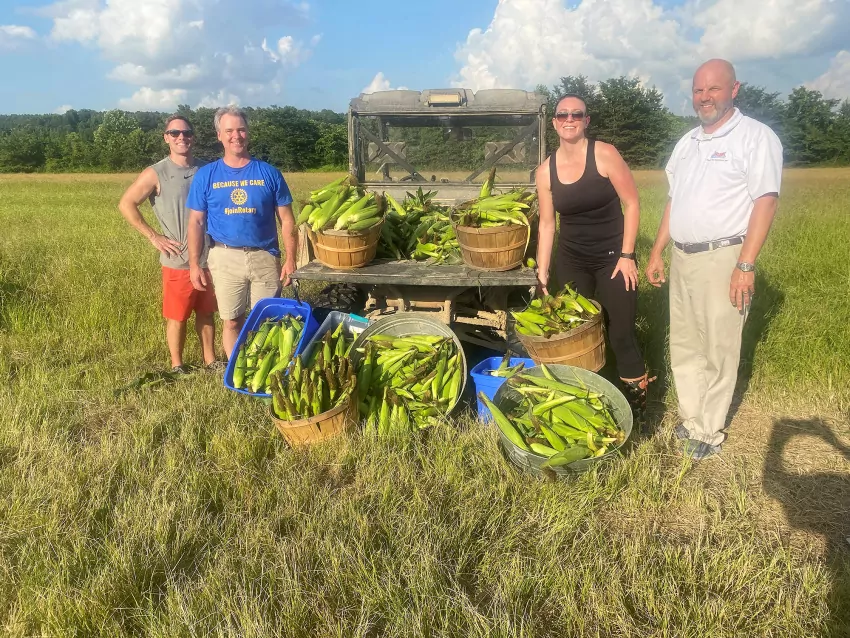 Rotarians, from left, Paul McCarley, Rodney Murphy, Jenny Herron and her husband Jason Herron and Robin Dambrino (not pictured) gathered more than 600 ears of corn for delivery to the Grenada Soup Kitchen and beyond. Local Duck Hill farmer Steven Stoker planted, raised and donated the corn. | Submitted Photo