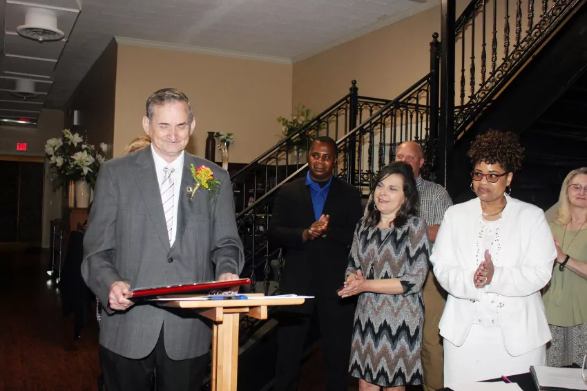 George Frazier sheds tears of joy after being named the Exchange Club of Grenada’s 48th Book of Golden Deeds recipient last Thursday evening. Pictured congratulating Frazier are Exchange Club members, from left, Sheriff Rolando Fair, President Joan Stewart, Garrett Pollan and Bobbie Willis. | Photo by Reggie Ross