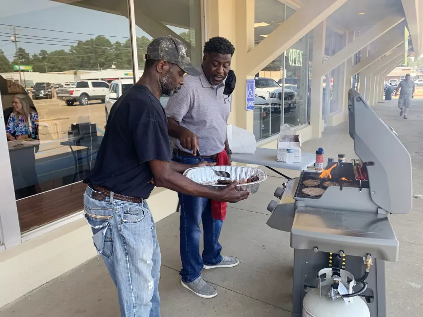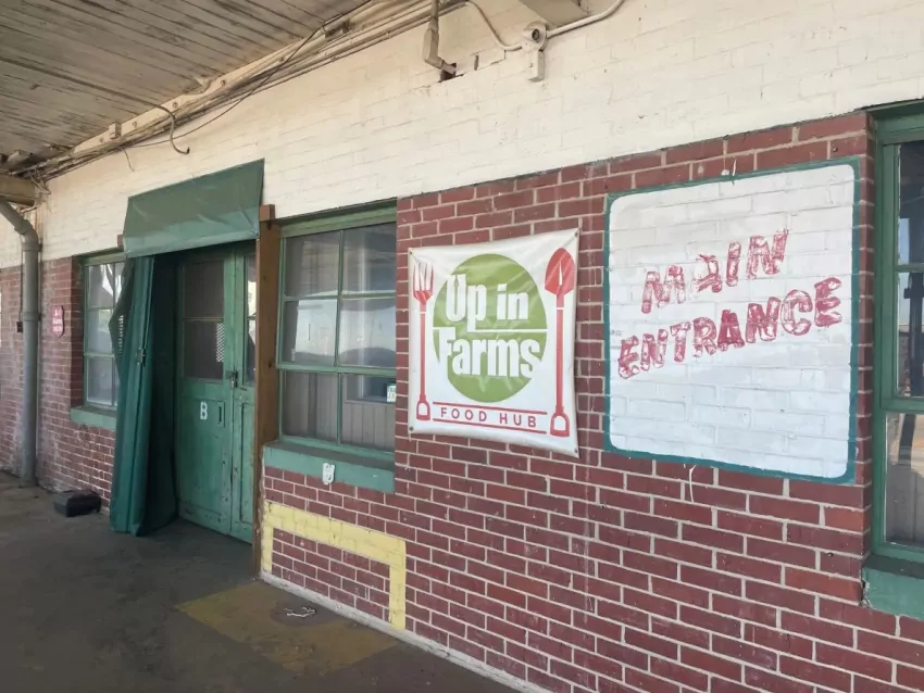 Public-private partners have put around $1 million into the Up in Farms Food Hub, with the goal of getting more locally grown produce into the commercial marketplace. The project, which operated for just one season since it began, is part of the Soul City Hospitality parent company. Chains and a padlock held the door to the building closed on Oct. 7, 2021. Credit: Anna Wolfe, Mississippi Today