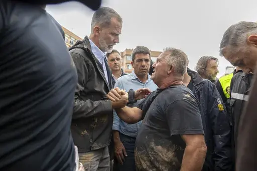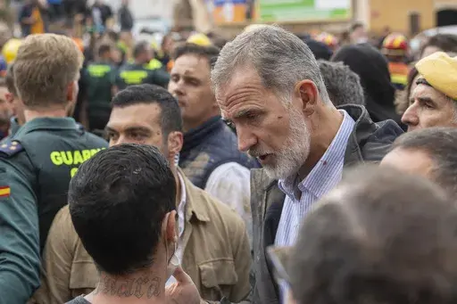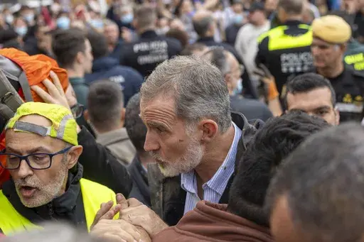 BARCELONA, Spain (AP) — Mud splattered the cheek of Spain's monarch as survivors of catastrophic floods unleashed their fury in a barrage of muck and mire. Felipe VI took it, literally, on the chin, and his determination to stay and speak to the enraged crowd could redefine his reign.