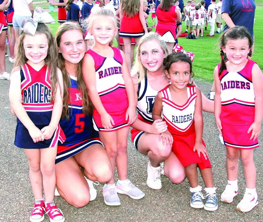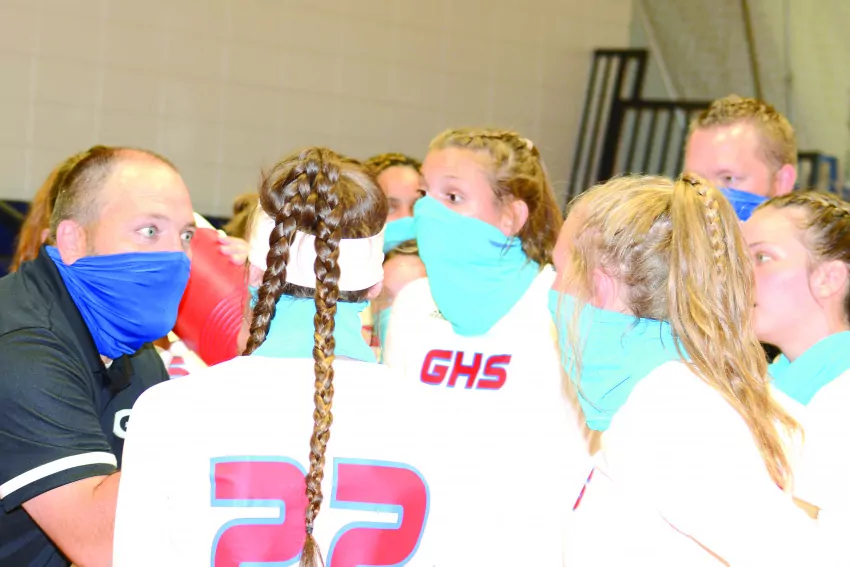 Grenada High School volleyball coaches Collin Ray (far left) and Cameron Tawater talk things over with the Lady Chargers during a break in action. The Lady Chargers opened the first-ever volleyball season Aug. 24 with a win over Winona. They downed the Lady Tigers at Winona, a night later, to improve to 2-0 on the season. | Photo by Chuck Hathcock