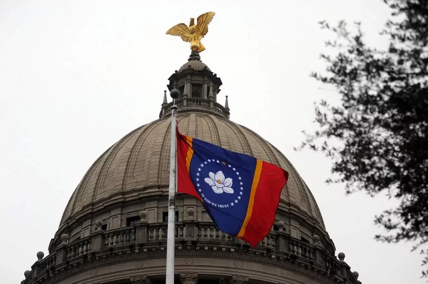 Mississippi House speaker Philip Gunn, center, and Lt. Gov. Delbert Hosemann, right, talk after Gov. Tate Reeves press conference at the State of Mississippi Woolfolk Building in Jackson, Miss., Thursday, May 7, 2020. Credit: Eric J. Shelton/Mississippi Today