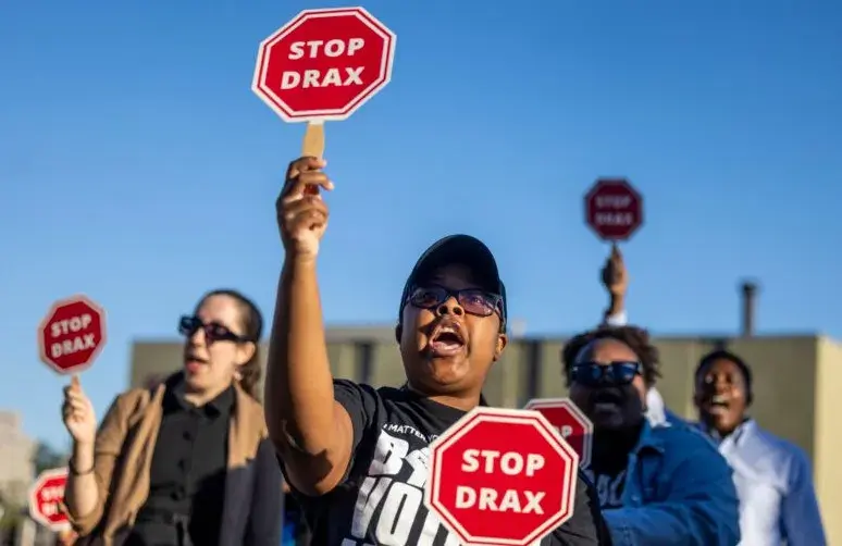 Antionette McKay, with the Mississippi People's Movement, stands with other protesters holding “Stop Drax” signs outside the Mississippi Department of Environmental Quality in Jackson, Miss., on Tuesday, Oct. 14, 2025. The group gathered as state officials weighed a permit that would set new limits on how much pollution Drax can release into the air. Credit: Eric Shelton/Mississippi Today