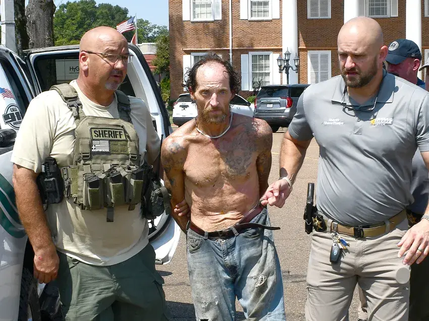 Flanked by Tallahatchie County Deputy Sheriff Jerry Williams II, left, and Panola County Sheriff Shane Phelps, right, fugitive Ewel "Bubba" Scott arrives outside the Tallahatchie County Jail in Charleston on Thursday, Aug. 14, 2025. (Photo by Clay McFerrin, Copyright 2025, Emmerich Newspapers Inc.)
