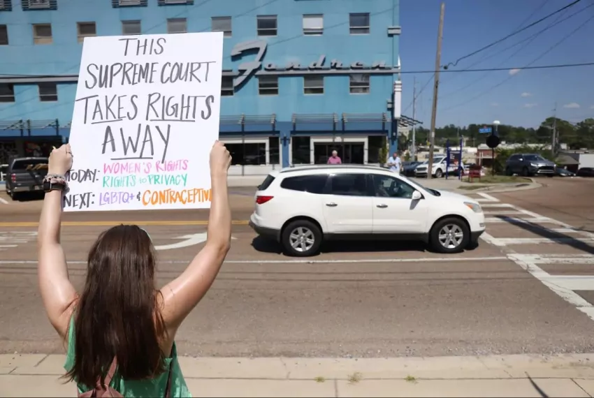 A pro-choice activist holds a sign outside of the Jackson Women's Health Organization in Jackson, Miss., Friday, June 24, 2022. The Supreme Court overturned Roe vs. Wade, the 1973 case that established a person’s right to an abortion. Credit: Eric Shelton/Mississippi Today