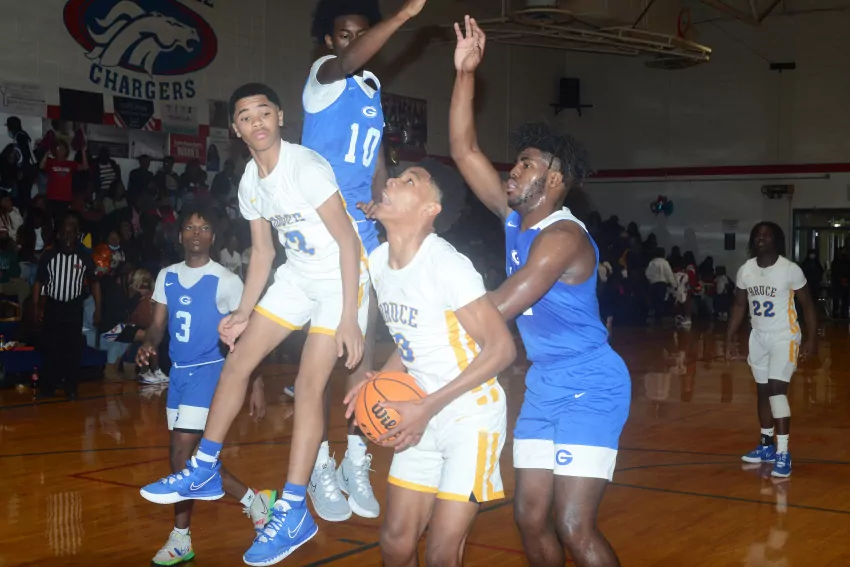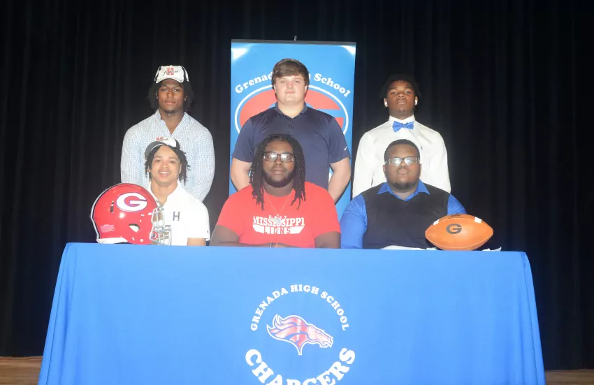 Grenada High School football players moving on to the next level, include, front row, from left, Jaheim Shack, Sontera Coleman and JaQuon Bledsoe. Back row, Joe Moss, Landon Trusty and Jalyn Patterson. The players signed Letters of Intent on National Signing Day last Wednesday. | Photo by Chuck Hathcock