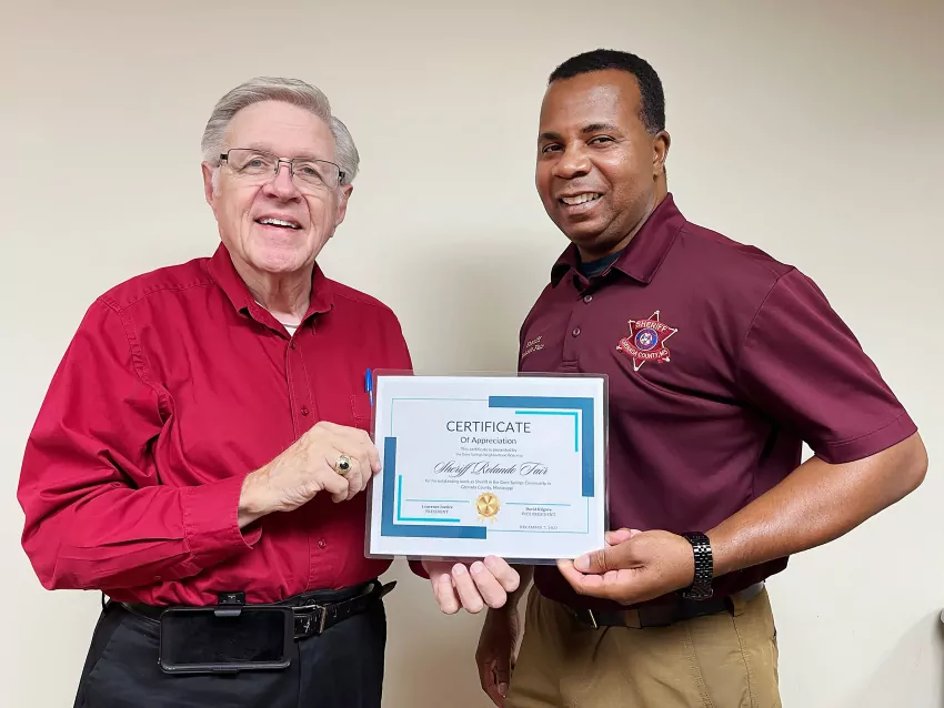 The Gore Springs Neighborhood Watch organization recently presented outgoing Grenada County Sheriff Rolando Fair with a Certificate of Appreciation, which read: “This certificate is presented by the Gore Springs Neighborhood Watch to Sheriff Rolando Fair for his outstanding work as Sheriff in the Gore Springs Community in Grenada County, Mississ