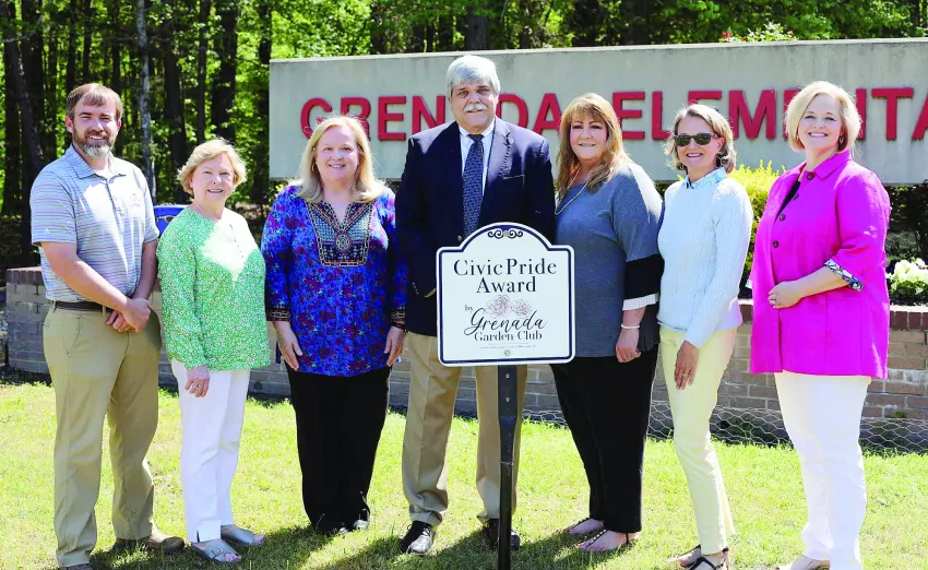 Posing for a photo with the award include, from left, Grenada Elementary School Principal Cole Surrell, Grenada Garden Club member Jane Parks, Grenada Upper Elementary School Principal Carol Tharpe, Grenada School District Superintendent David Daigneault, Grenada School District Administrative Operations Officer Lynne Russell and Grenada Garden Club members Lauren Leslie and Lee Murphy. | Submitted Photo