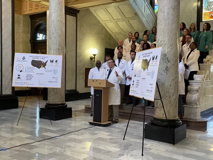 Care4Mississippi coalition members Kimberly Hughes, from left, Blair Ewing, and Khaylah Scott discuss the coalition and its mission on Thursday, Jan. 11, 2024, at the Mississippi Health Advocacy Program office in Jackson, Miss. Credit: Eric J. Shelton/Mississippi Today