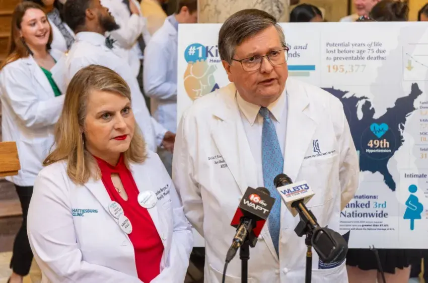 Dr. Jennifer Bryan, left, and State Health Officer Dr. Daniel Edney speak to the media about the Mississippi State Department of Health’s 2024 Public Health Report Card at the Capitol in Jackson, Miss., on Tuesday, Jan. 28, 2025. Credit: Eric Shelton/Mississippi Today