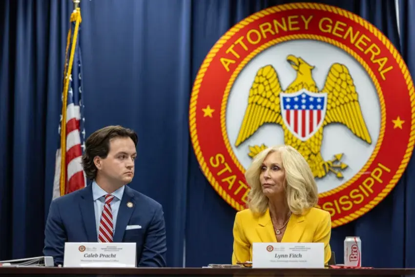 Special Assistant Attorney General Caleb Pracht, left, and Attorney General Lynn Fitch listen as committee members introduce themselves during the first meeting of the Mississippi Opioid Settlement Advisory Committee at the Walter Sillers Building in Jackson, Miss., on Wednesday, July 9, 2025. Credit: Eric Shelton/Mississippi Today