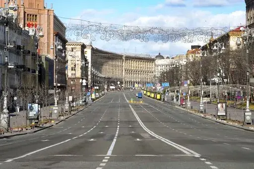 Only an occasional car appeared on a deserted main boulevard of Kyiv as a strict 39-hour curfew kept people off the streets until Monday morning. Authorities warned that anyone venturing out without a pass would be considered a Russian saboteur.