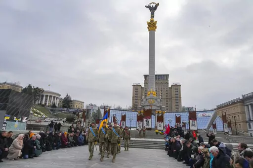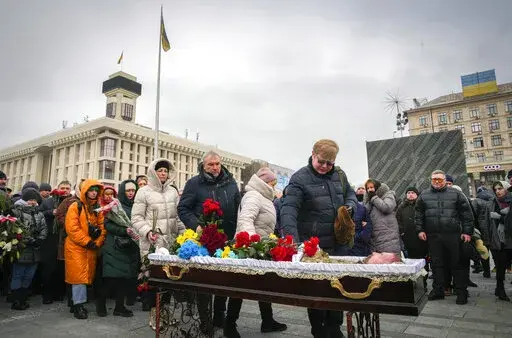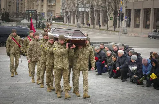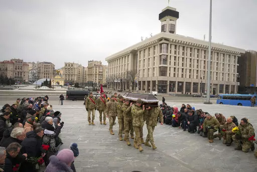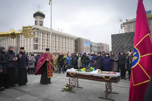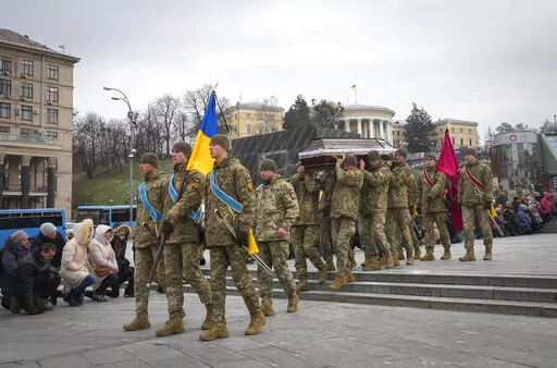KYIV, Ukraine (AP) — Ukrainian soldiers, family and mourners gathered in frigid weather in Kyiv on Sunday to pay tribute to a soldier killed fighting against Russian forces in Bakhmut, the strategic city under siege on the eastern front.