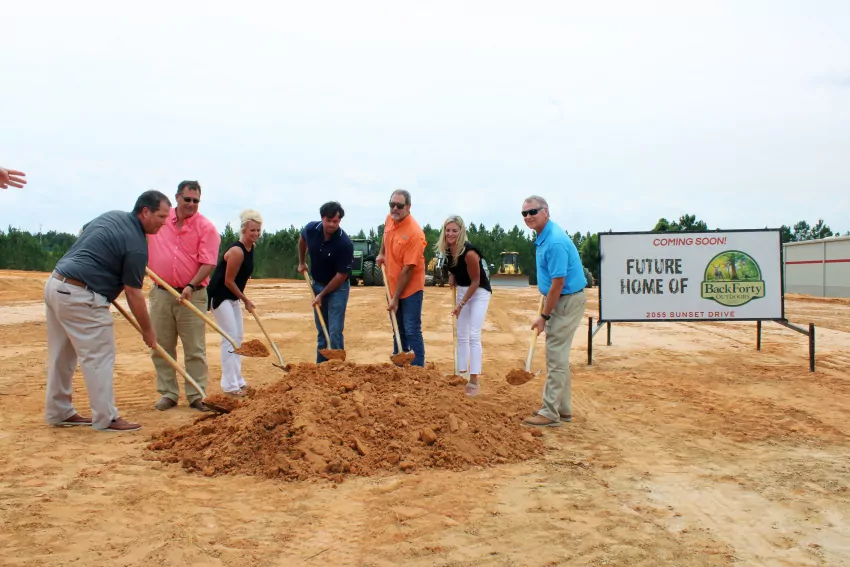 Back Forty Outdoors held an official groundbreaking ceremony last Wednesday afternoon. Those on hand included, Grenada State Bank City President Chris Hathcock, Grenada County Board of Supervisors President Michael Lott, Erica Culpepper, owners Jay Culpepper and Mike Campbell, Samantha Campbell and Grenada State Bank Executive Vice President Harry Lott. | Photo by Adam Prestridge