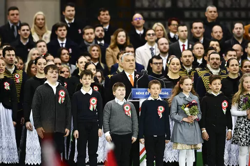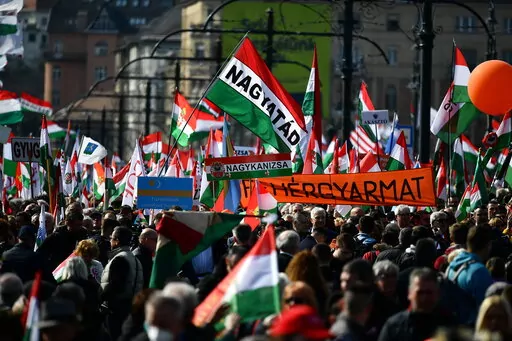 Several hundred thousand Orban supporters gathered Tuesday on the west bank of the Danube River before surging across the city's Margaret Bridge toward the Hungarian Parliament, where Orban spoke at length about the need for Hungary to keep out of the war in Ukraine.