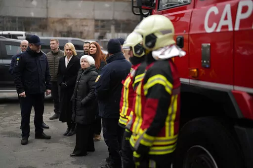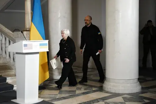 KYIV, Ukraine (AP) — U.S. Treasury Secretary Janet Yellen said Monday her first visit to Ukraine underscored Washington's commitment to continuing its economic support for the country, as the din of air raid sirens echoed across the Ukrainian capital.